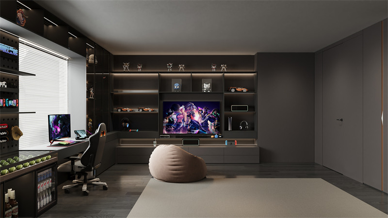對于熱愛娛樂的活力青年,“樂在臥室” 設計融入了豐富的娛樂元素。配備了超大屏幕的電視或投影儀,打造私人家庭影院。競技區則配備可升降的電競桌椅,自適應腰托和4D 扶手可以根據身體姿勢自動調節,緩解疲勞。此外,裝備補給站就在手邊,方便拿取手柄耳機等裝備,讓你在游戲中隨時保持最佳狀態,讓臥室成為娛樂與休閑的雙重空間。