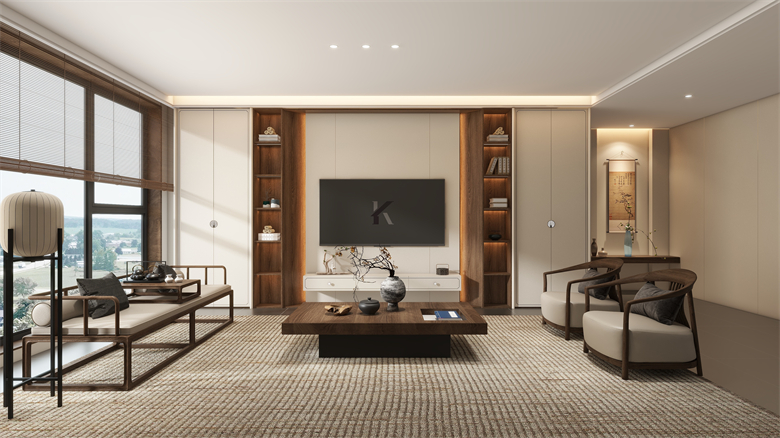 客廳作為家的核心,在林隱系列下盡顯新中式雅致。中式羅馬柱以簡潔線條傳承古韻,融入現代空間添層次美感。沙發背景墻3D打印山水畫卷,光影間似聞流水潺潺。懸浮電視柜輕盈,留白處藝術品點綴,空間在虛實中呼吸,盡顯精致內斂。