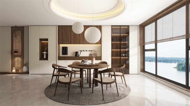 餐廳區域將古樸韻味與精妙結構融入室內。疊級設計營造視覺漸進,內斂卻不失格調;格柵抽屜設計精妙,以高定工藝打造含蓄的中式美感。圓形吊燈與天花板環形燈帶相呼應,柔和的燈光照亮整個用餐區。細膩木紋裝飾與現代簡潔的線條相融合,展現了禪意新中式的精致與內斂,在簡與繁、虛與實之間,構筑出一個既能滿足現代生活需求,又能安放文人雅趣的餐飲空間。